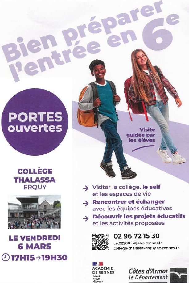 Le collège Thalassa, situé au cœur de la commune d’Erquy, invite les parents et futurs élèves à ses portes ouvertes.