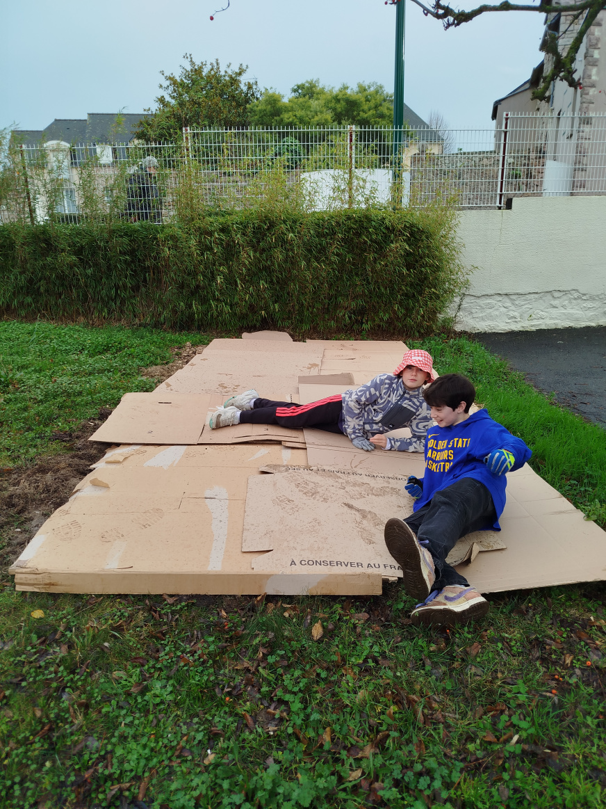 Cette année, le collège lance un projet de jardin pédagogique. Avant de planter des légumes, des fleurs ou des plantes aromatiques, il a faut préparer le terrain. La première étape est de recouvrir la pelouse d’une bâche pendant tout l’hiver.