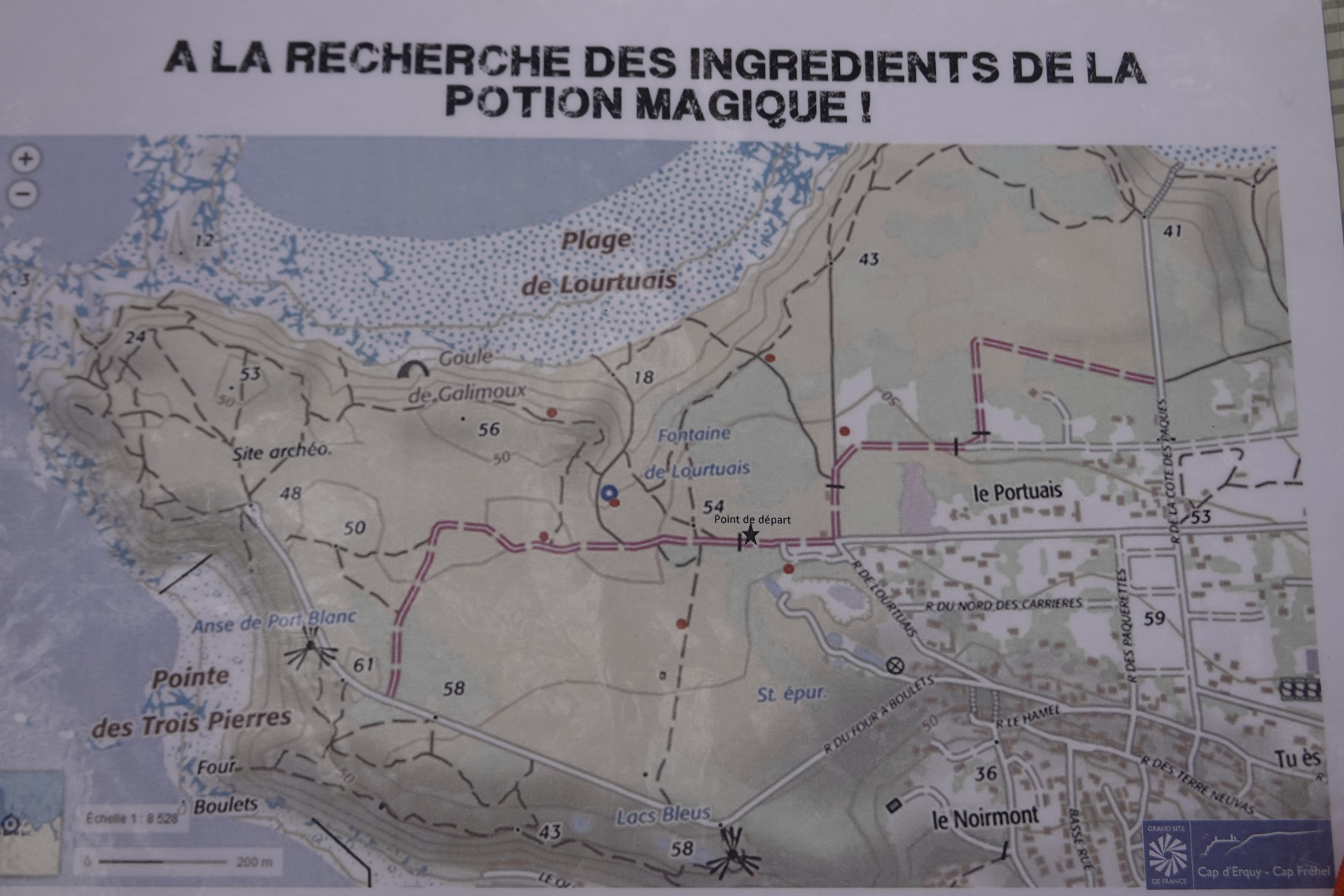 Les élèves ont du aider Panoramix à récolter les ingrédients nécessaires à la confection de la potion magique. Par équipe, les élèves ont du se repérer sur une carte, retrouver des boîtes cachées, répondre à des questions sur la lande, la biodiversité et l’histoire du Cap pour les ouvrir et ainsi découvrir l’ingrédient mystère à récoler.