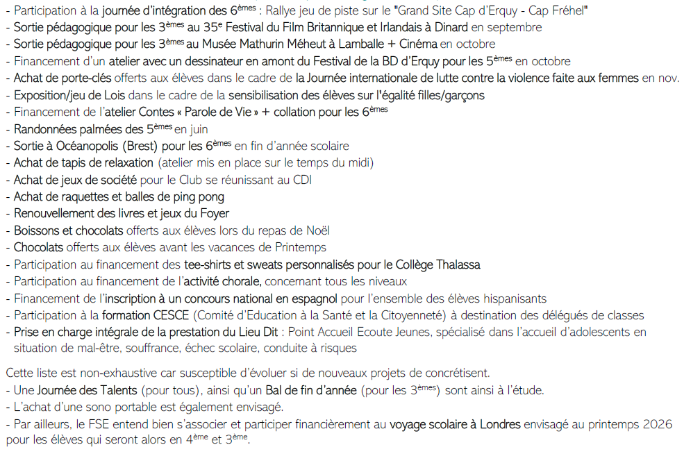 - Par ailleurs, le FSE entend bien s’associer et participer financièrement au voyage scolaire à Londres envisagé au printemps 2026 pour les élèves qui seront alors en 4e et 3e.