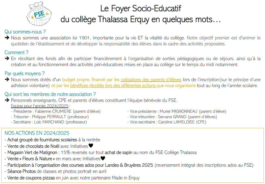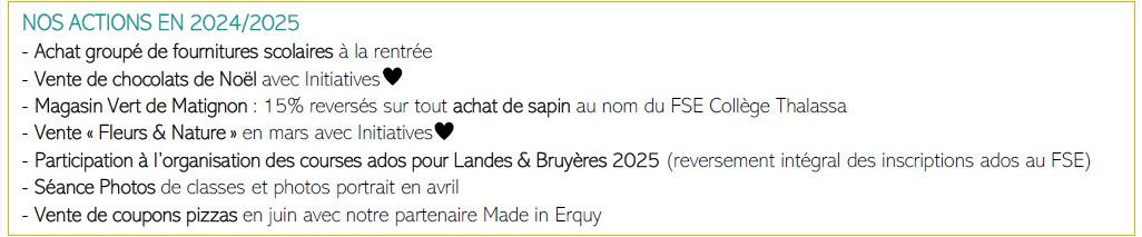 - Magasin Vert de Matignon : 15% reversés sur tout achat de sapin au nom du FSE Collège Thalassa